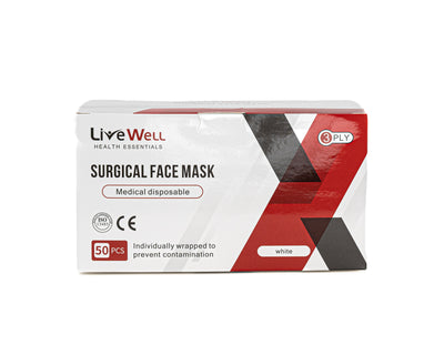 Live Well Health Essentials Surgical Face Masks come in a convenient box of 50 masks. They are individually wrapped and come in 2 colours.